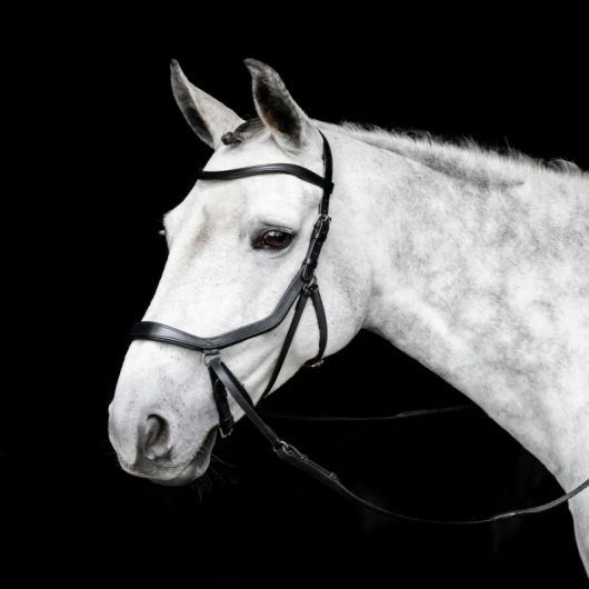 Ce bridon innovant conçu d'un seul tenant est confectionné dans un cuir de qualité rehaussé de surpiqûres contrastantes au niveau du frontal et du noseband.