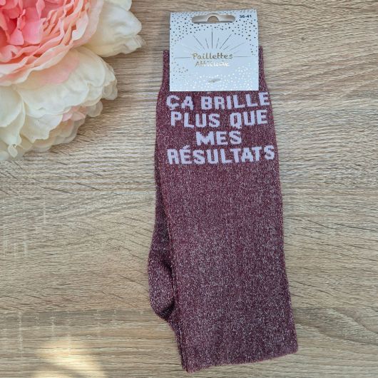 Les chaussettes d'équitation pailletées Paillettes Attitude "Ca brille + que mes résultats" affichent avec humour l’importance de briller en piste, peu importe les barres tombées ou les fautes.