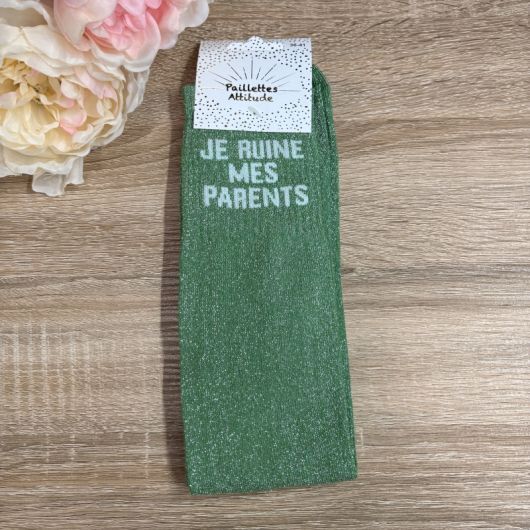 Les chaussettes d'équitation pailletées “Je ruine mes parents” assument avec humour la réalité du quotidien : entre cours, tapis, soins et concours, on fait briller le cheval… et la CB de la famille.