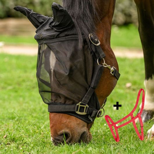 Un pack comprenant un licol de prairie sans boucles + un masque anti-mouches de licol.